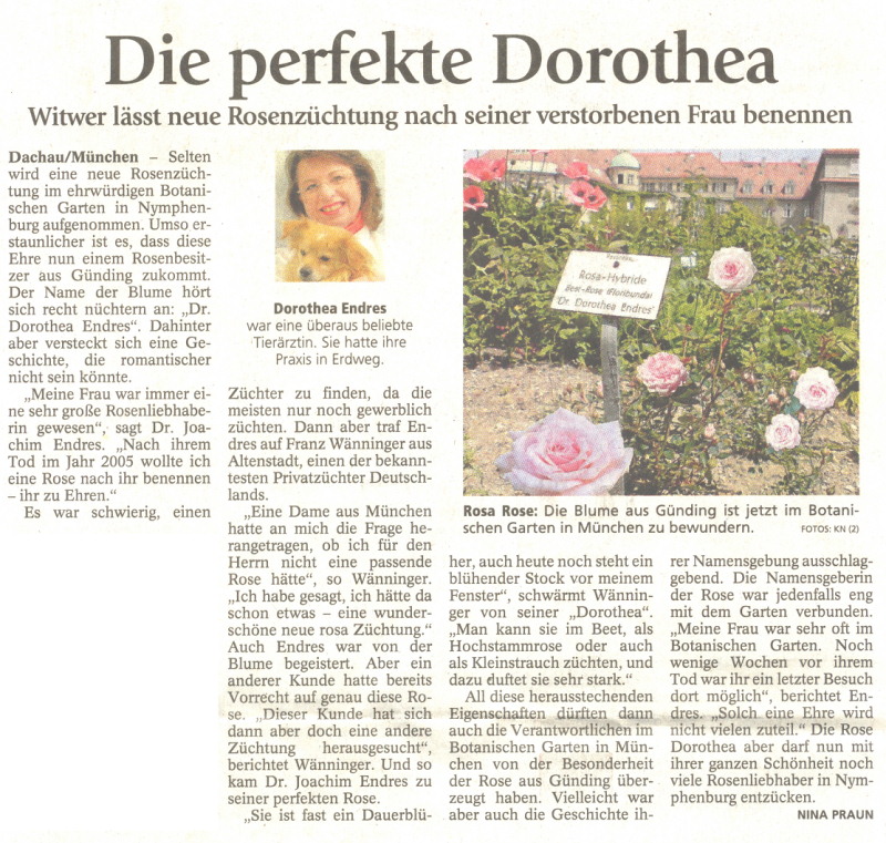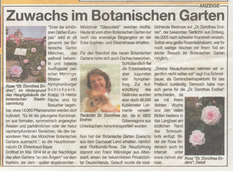 Interessenten können die Rose "Dr. Dorothea Endres" zum Selbstkostenpreis von € 10 pro Rose erwerben. Die nächsten Rosen sind im Frühjahr 2009 verfügbar. Aufgrund großen Interesses bitten wir um Vorbestellung: email: kontakt@netvet.de Tel.: 08131 61 68 64 Fax: 08131 7 97 64 Dr. Joachim Endres |